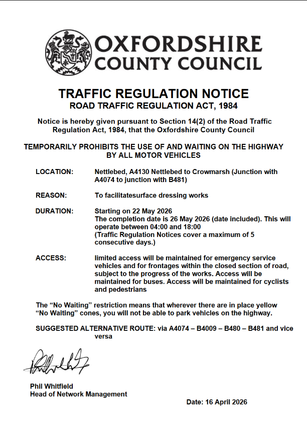 - TTRO (T17639) Temporary Road Closure and No Waiting – Nettlebed, A4130 Nettlebed to Crowmarsh (Junction with A4074 to junction with B481)
